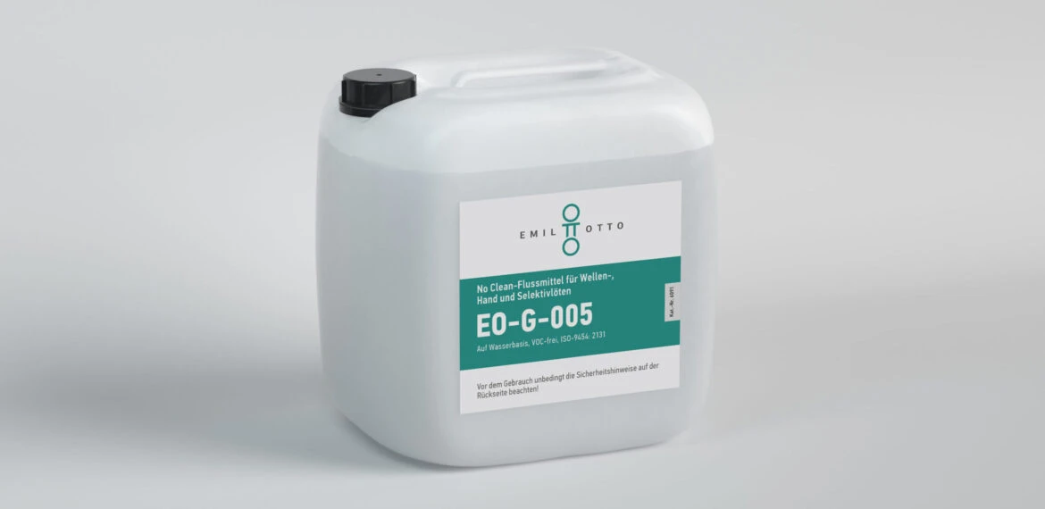 Des Weiteren stellt Emil Otto das No Clean-Flussmittel EO-G-007 vor, welches ebenfalls zum Wellen- und Selektivlöten von Leiterplatten geeignet ist. Das Flussmittel enthält organische, halogenfreie, aktivierende und speziell für die Lötprozesse abgestimmte Additive. Die Neuentwicklung wurde in einer speziell auf die thermischen Anforderungen des Lötprozesses abgestimmten Kombination mit bleihaltigen und bleifreien Loten entwickelt. Darüber hinaus basiert das EO-G-007 auf einer neuartigen Formulierung zur Stabilisierung und Verbesserung des Anwendungsprozesses im Vergleich zu herkömmlichen Flussmitteln auf Wasser- oder Teilwasserbasis. Mit einem Feststoffanteil von 7 % bedient Emil Otto weiterhin die hohe Nachfrage nach wasserbasierenden Flussmitteln mit einem höheren Feststoffanteil.